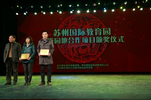 接下来,国际教育园各院校领导首先为国际教育园优秀园地合作项目进行了颁奖,来自教育园9所院校的22个园地校企合作和产学研合作项目在苏州经贸职业技术学院进行了汇报答辩和评审,最终教管办资源共享与产教合作处处长万海防先生宣布了评选结果并进行了颁奖,我院也在此次活动中获得了优秀园地产学研合作项目一等奖的好成绩。