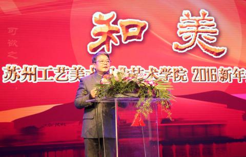 学院党委书记王建良同志发表了热情洋溢的新年贺词。他代表学院党委、行政向全院师生送上最真挚的新年祝福,与全院师生分享了2015年学院在人才培养、科学研究、社会服务、文化传承等方面取得的成就,回顾了学院教育教学改革、校园文化建设取得的丰硕成果。王书记指出,即将到来的2016年是“十三五”开启之年,学院要继续优化专业结构、提升建设水平、推进多元融合课程体系建设、提升教师队伍素质、深化“工作室制”人才培养模式改革、增强产教融合、完善多元化评价机制,努力打造江苏省高职艺术设计人才培养高地;要继续大力推进传承创新,助推区域文化产业提振复兴、助推工艺乡镇发展道技相融、助推行业软实力增长、助推非遗传承,努力打造传统工艺美术研究及成果转化高地;要继续引进先进办学理念、教育模式、课程资源、加强国际合作、加大师生交流力度、开展与外资企业的校企合作,努力打造江苏省艺术设计国际交流特色窗口。