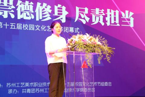 首先,学院副院长张华致闭幕词。她代表学院党委和行政对为本届文化艺术节付出辛勤努力的活动承办单位以及给予本届文化艺术节大力支持的老师们、同学们表示衷心的感谢。向在本届校园文化艺术节中取得优异成绩的师生表示最诚挚的祝贺。她说,本届文化艺术节紧扣“崇德修身,尽责担当”的主题,开展了高雅艺术进校园、“筑梦青春,思辩未来”大学生辩论赛、“崇德修身,尽责担当——爱读书”系列读书主题活动、大型原创话剧《未央歌》、苏州高校配乐诗朗诵大赛、“WE ARE FAMILY”第四季苏州高校联谊活动、美院公共标识手绘美化大赛、教学空间装饰设计大赛、“井上添画 多彩美院”——手绘井盖活动、第一届汉字创意设计大赛等十八项活动,以专业文化、阅读文化、创业文化、时尚文化等版块为构架,以崇德修身为导向,以尽责担当为己任,通过举办形式多样的高品质文化艺术活动,为美院青年学子搭建了展示青春梦想、施展艺术才华的广阔舞台为学院营造了健康高雅的文化艺术氛围。