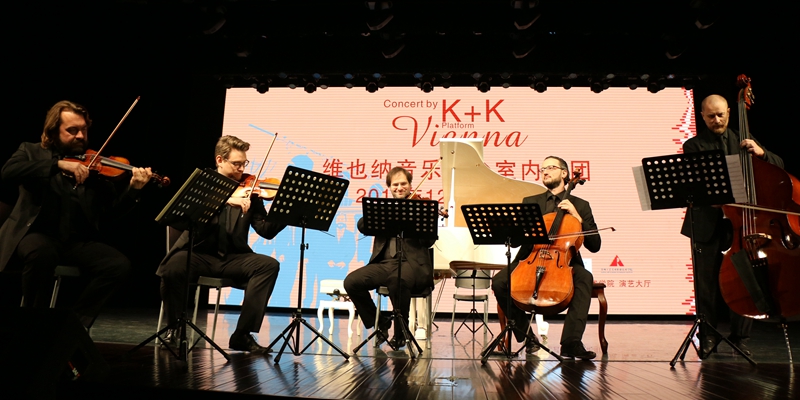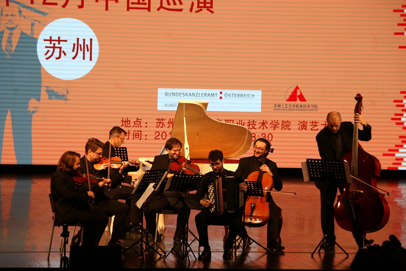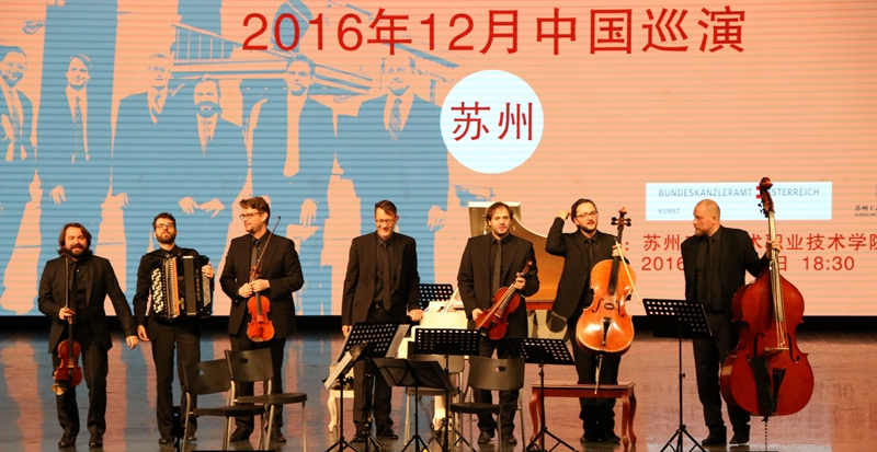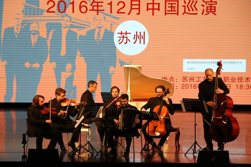 为了进一步拓展国际交流,丰富校园文化生活,提升当代大学生的艺术修养与审美情趣,近日,我院迎来了国际享誉盛名的维也纳“K+K”音乐平台室内乐团。风格多样的乐曲,热情忘我的演绎,为当晚在场的所有观众奉献了一场高雅的视听盛宴。学院党委书记王建良、院长廖军,各国留学生代表,以及苏州市职业大学、苏州经贸职业技术学院等兄弟院校来宾和我院近千名师生代表现场聆听了音乐会。